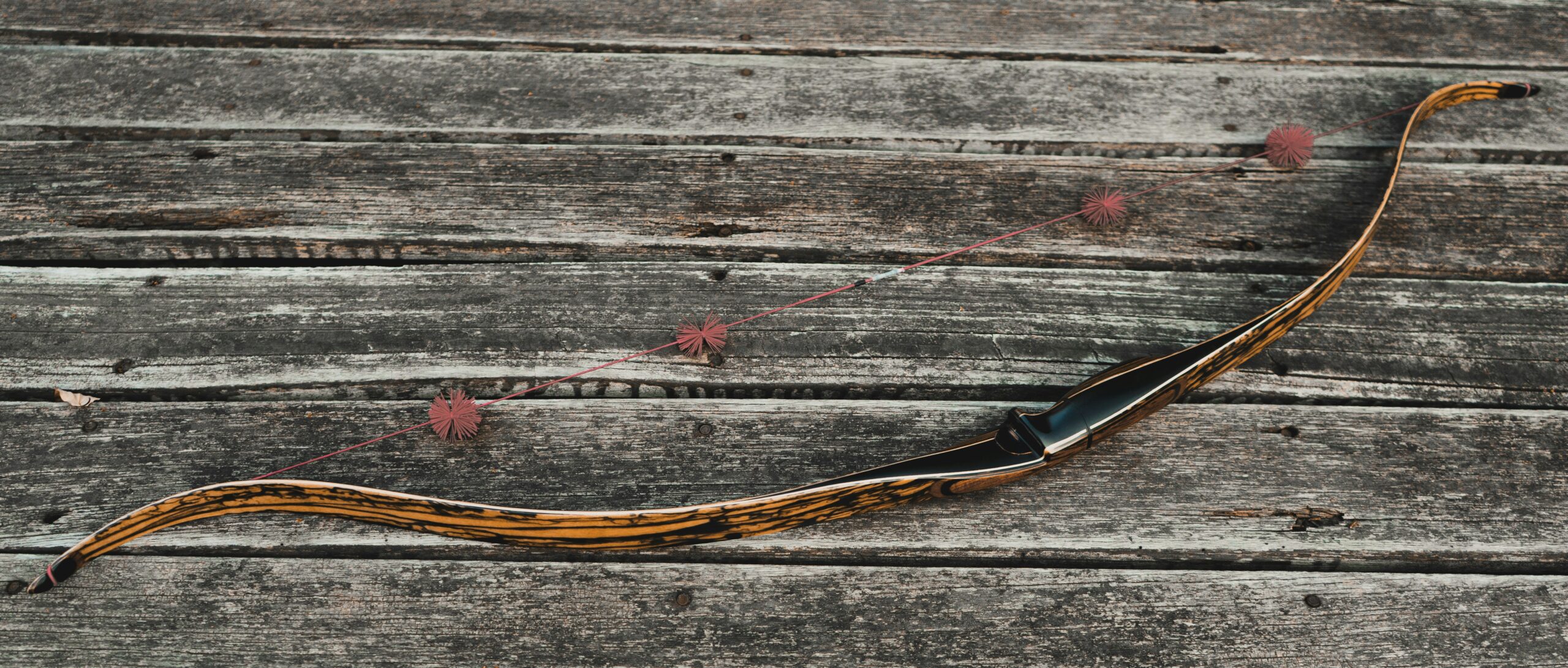 A Longbow is usually constructed from a single piece of wood or several layers of wood. It differs from a Recurve in that it lacks the curved tips at the end of its narrow yet thick limbs, which bend gracefully through the entire length of the bow. The limbs form the letter ‘D’ when strung and the bowstring does not touch the limbs. Longbows have a straight grip and may have a shelf in the riser that functions as an arrow rest.